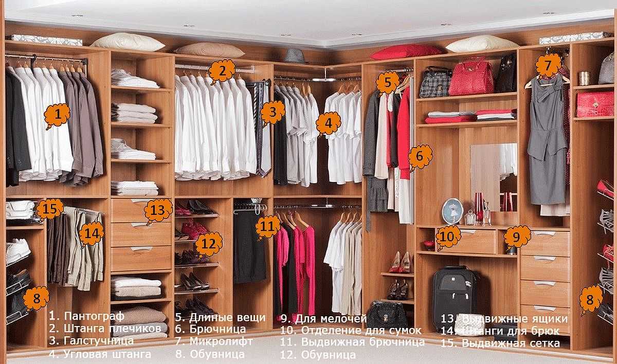 Это все приспособления, которые используют при наполнении шкафов-купе. Главное — правильно их разместить, определить размеры секций и дверей.
