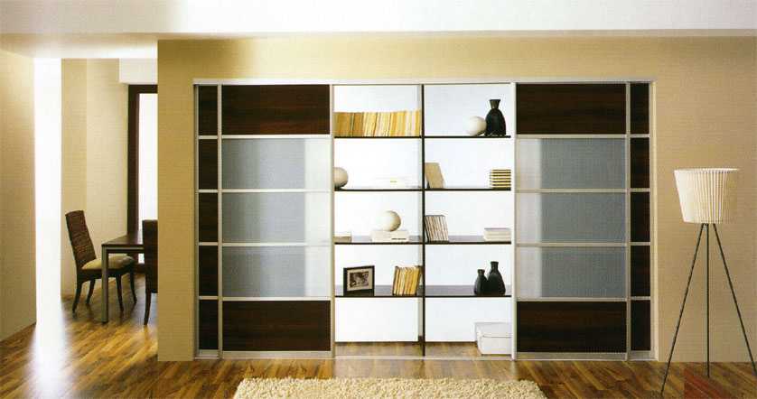 - большая площадь зала в квартире может быть разделена шкафом на части, создавая зонирование территории. Для этого подходят купейные конструкции, также шкаф модульный со стеллажами не создаст иллюзию нагромождения. Исполняющая роль спальни гостиная станет уютней после зонирования, а шкаф трансформер с откидной кроватью максимально эффективно использует свободное пространство.