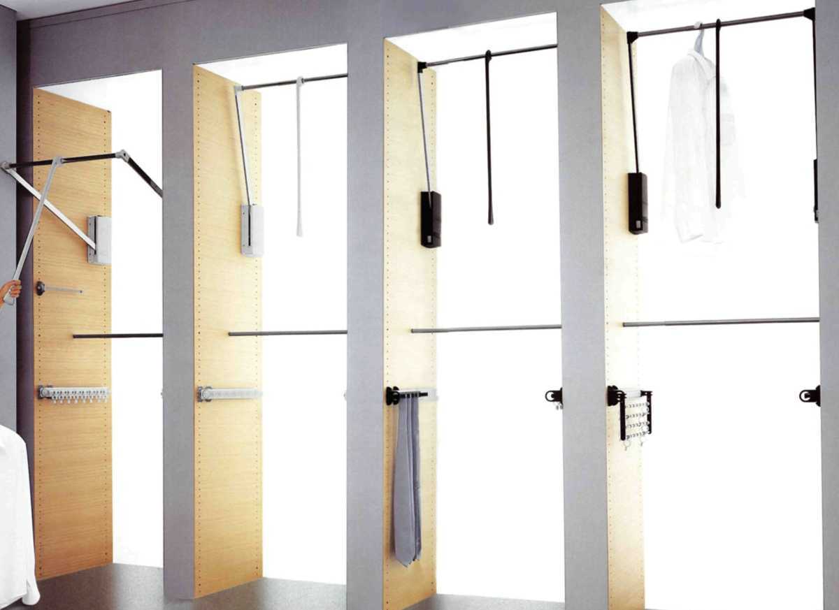 Часто отделения для одежды на плечиках более удобно располагать в верхней части шкафа, оставив нижнюю часть под полки и ящики. В этом случае ставят не обычные перекладины, а подвижные. Это устройство для наполнения шкафа купе называют «пантографы».
