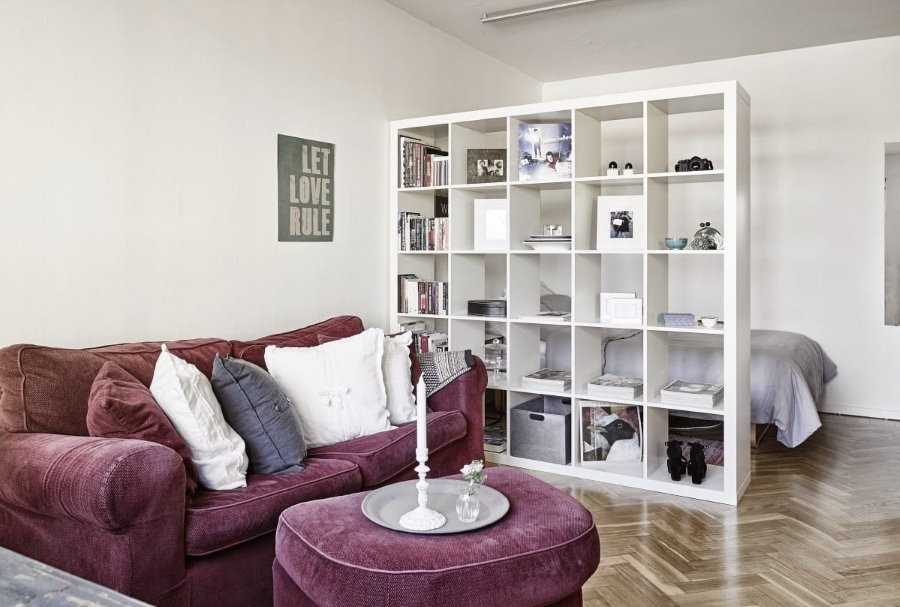 Модульные секции популярны в маленьких квартирах. Основа часто на удобных колесиках, может, не очень устойчива, но легко переместить в любое место. Простой дизайн, секции крепятся кронштейнами.