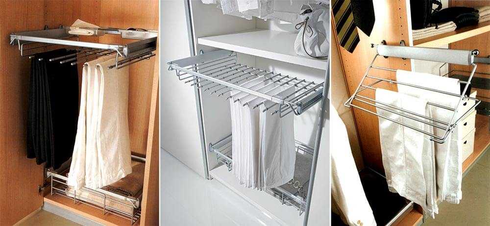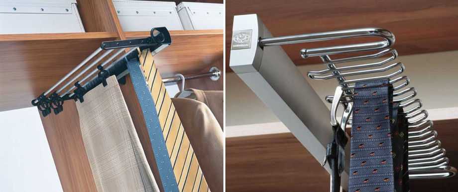 Вешалки для брюк, шарфов, ремней и похожих предметов могут располагаться в отдельном отсеке или быть рядом с основным ригелем. Выбирая второй вариант, стоит убедиться в том, что висящие предметы одежды не мешают друг другу.