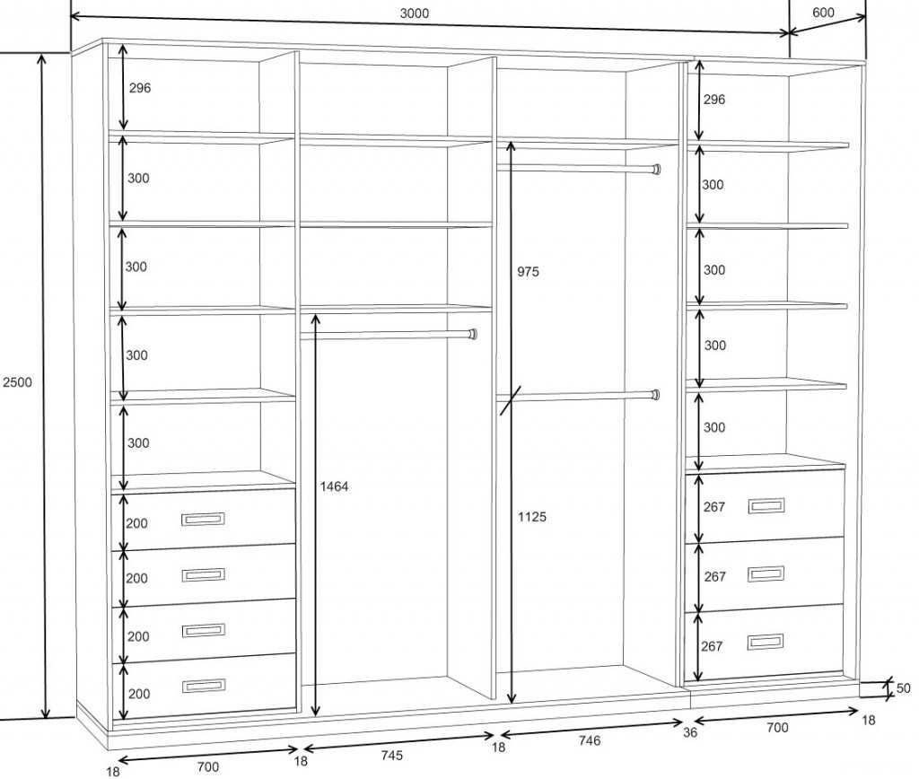 - ширина шкафа купе тоже ограничена размерами листа ДСП. Для ее увеличения в чертеж добавляют перегородки. При этом готовая конструкция будет состоять из двух или более модулей;