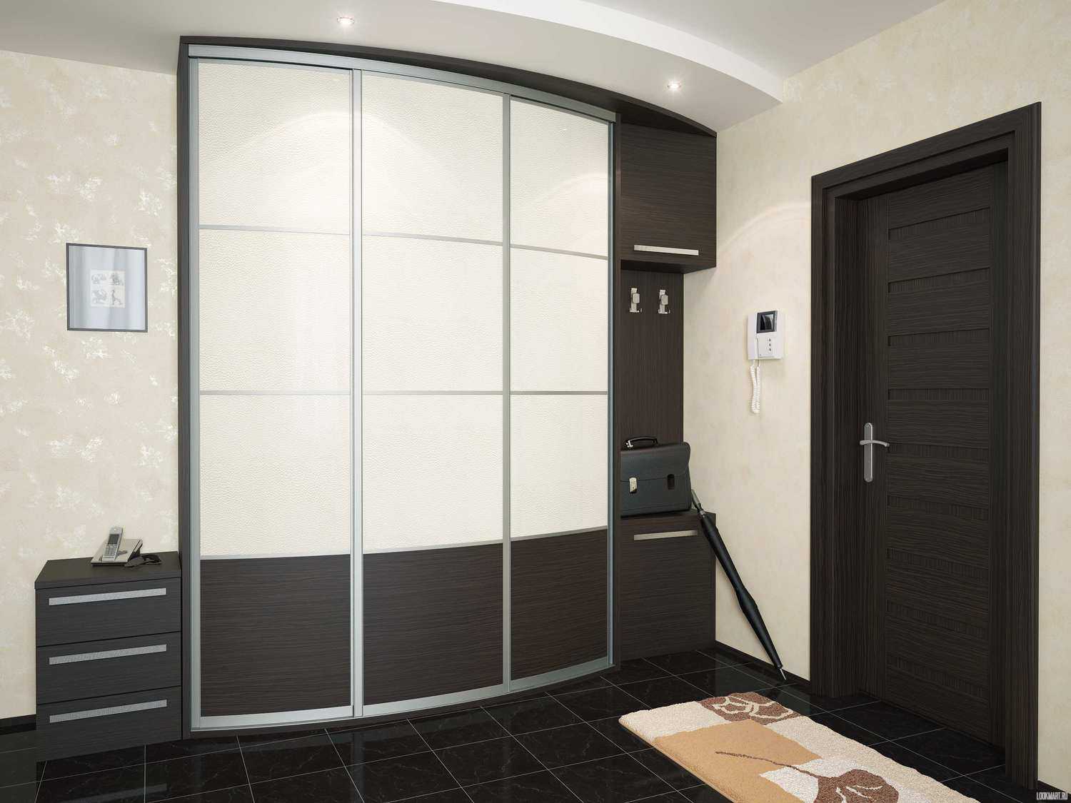 - выпуклая модель — лучше всего вписывается в небольшие прихожие, в которых нет длинных стен. Используя малый радиус изгиба фасадов, передней части шкафа придают овальную форму. Вогнутые модели устанавливают в нишах по типу встроенных конструкций;
