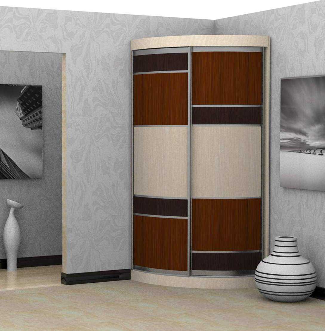 Шкаф соединяется угловыми модулями, ввиду чего изделие приобретет завершённый вид. Фотографии подобных моделей зачастую можно встретить в журналах по благоустройству жилища. Чтобы шкаф не выглядел монотонно, используются комбинированные материалы (например, модуль с зеркалом, разноцветные панели и др.). Закруглённые элементы бывают лишь в количестве двух. Угловые модули с внутренними радиусами соединяют мебель в одно целое.