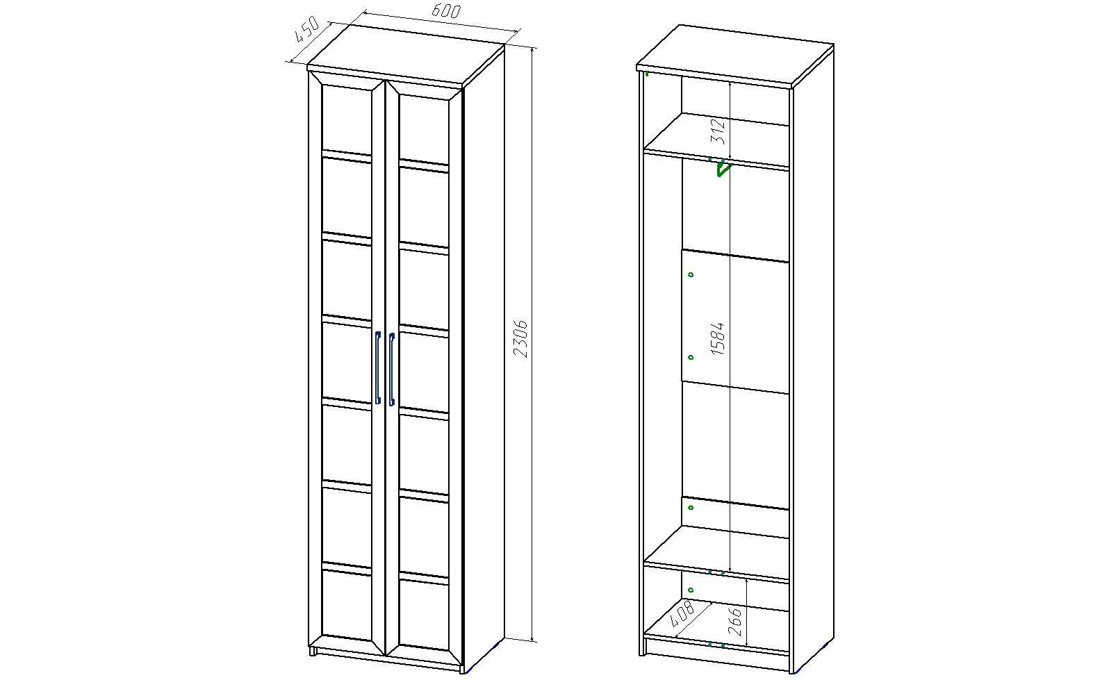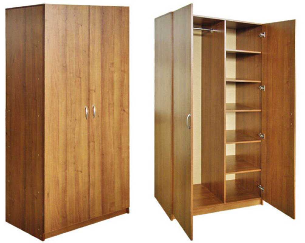 - двустворчатый — шкаф распашной классика со штангой и полками шириной 110 см. Как правило, двустворчатые модели подбирают для маленьких комнат, когда варианты большего размера просто не помещаются;