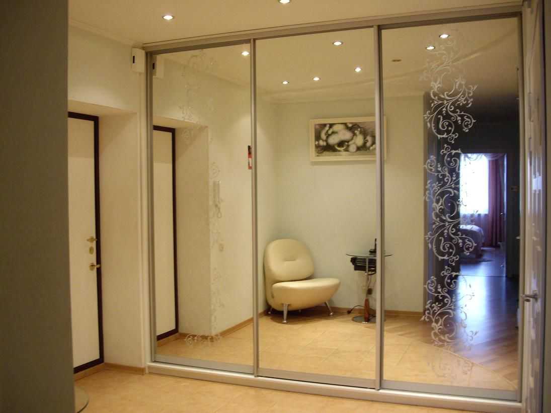 - зеркальные фасады — они подходят, когда нужно создать иллюзию расширенного пространства, визуально переформатировать его. Пользуется популярностью купе с пескоструйным рисунком, гравировкой с использованием песка и воды под большим давлением;