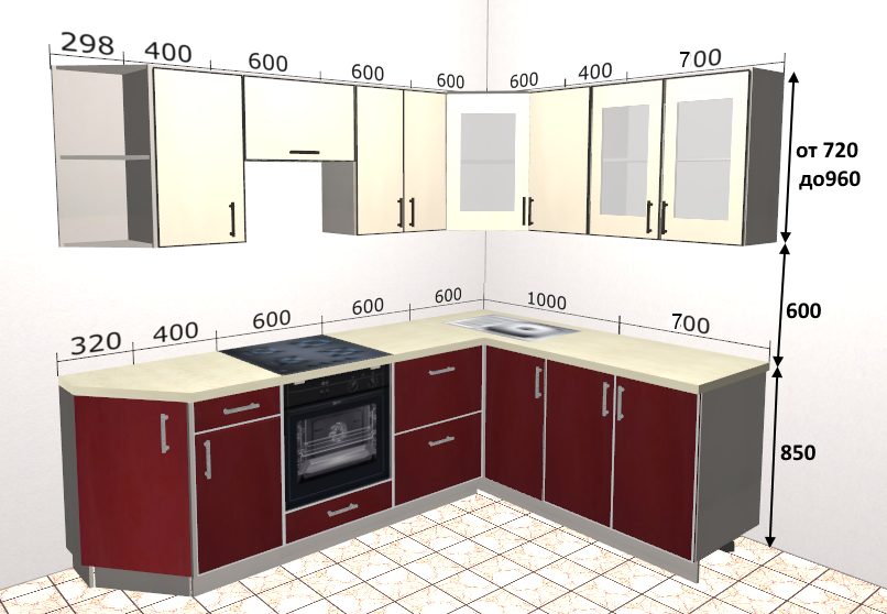Главные предметы кухонного гарнитура и основа ставятся на пол. Это мойка, газовая плита (или варочная панель с духовкой), посудомойка. Полки в основном используются под кастрюли и сыпучие продукты. Жильцам среднего роста подойдёт высота нижнего яруса в 83 см, это сумма следующих значений: