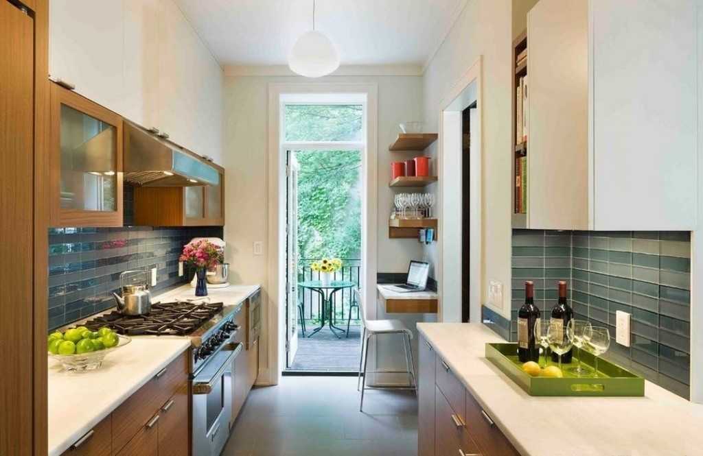 Наиболее универсальный вид планировки, который идеально подходит для небольших и узких кухонь. Все оборудование располагается линейно вдоль одной стены, однако данный вариант можно считать функциональным при длине помещения от 2 до 3,6 м. В противном случае расстояние между зонами становится либо слишком маленьким, либо слишком большим. При такой планировке холодильник и плиту обычно устанавливают в противоположных концах ряда, а мойку — посредине, предусматривая между мойкой и плитой разделочный столик. Для увеличения полезной площади целесообразно использовать высокие шкафы.