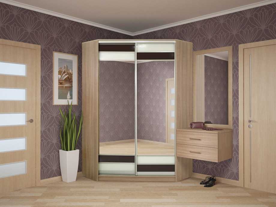 Часто пространство на стыке двух стен в прихожей не используется полностью. Там может беспорядочно стоять обувь и висеть верхняя одежда на крючках, прибитых к стенам. Однако в угол отлично впишется шкаф-купе. Угловые конструкции могут быть трех видов: