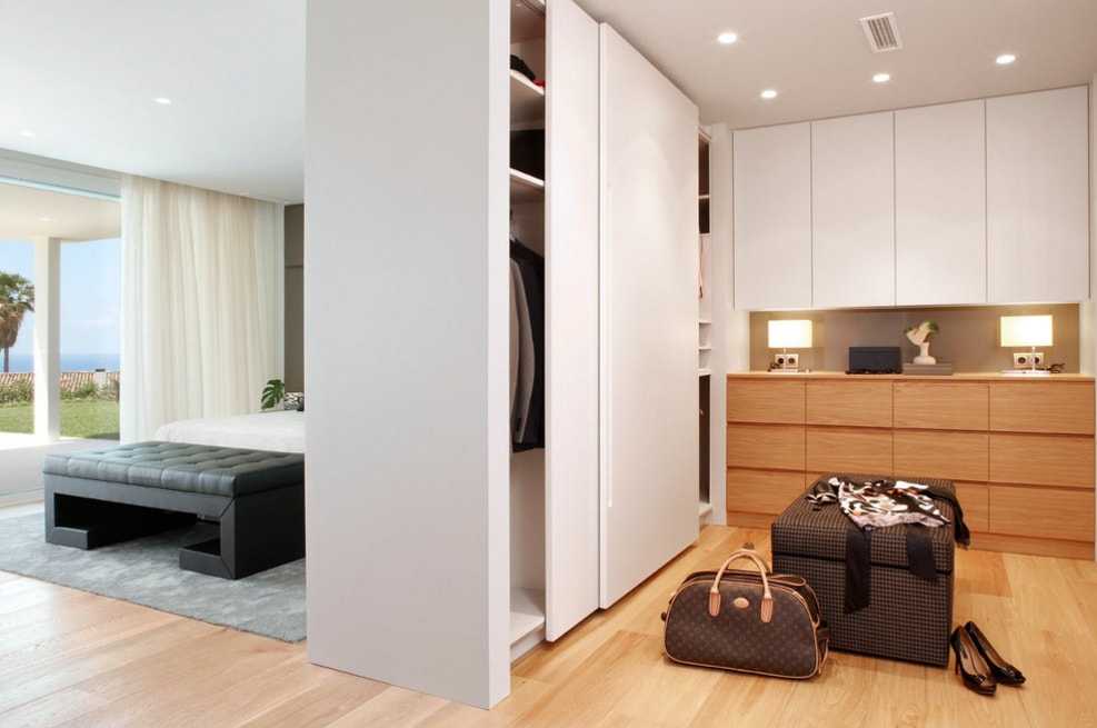 Вместо обычного шкафа предпочтительнее шкаф-купе. Имея высоту до самого потолка, он разместит внутри себя одежду, обувь и головные уборы