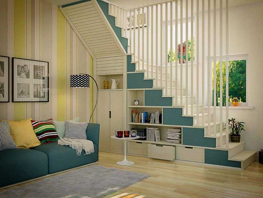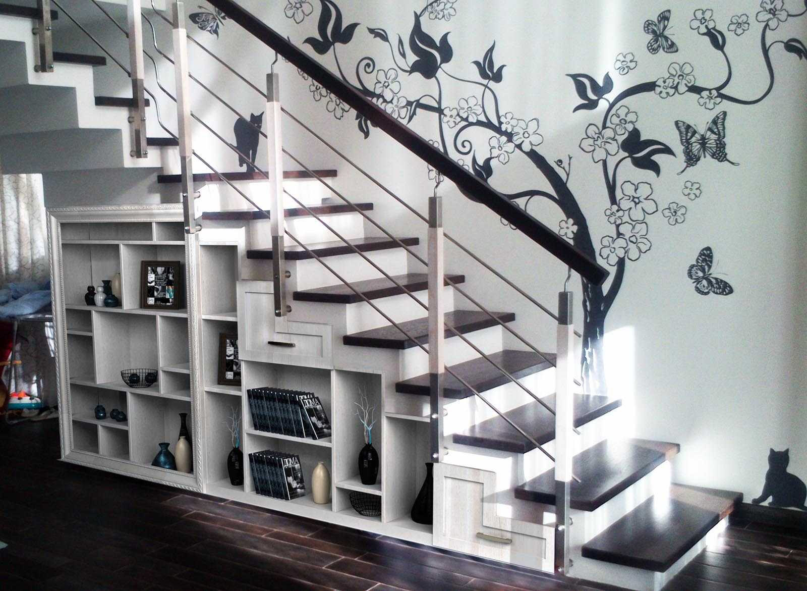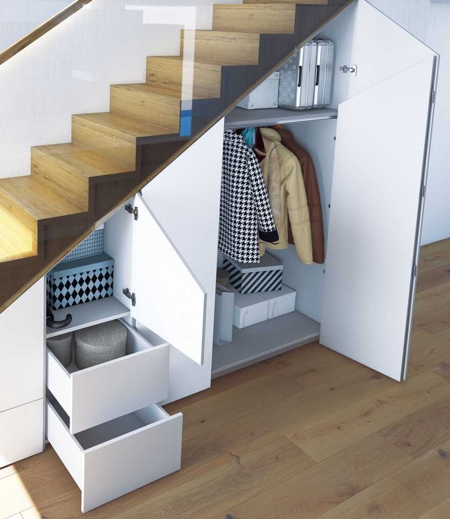 Встроенный шкаф или комбинированная конструкция создают единый комплекс с внутренней лестницей дома или квартиры. Нестандартные решения играют роль в формировании дизайна, обеспечивают удобства владельцев жилья. Оригинальные предметы интерьера позволяют:
