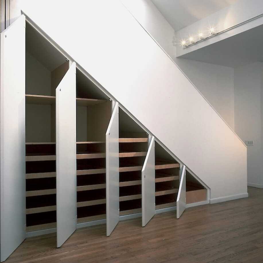 Встроенные под лестницей шкафы и стеллажи успешно применяются в городских многоуровневых квартирах, многоэтажных частных домах, на дачах.