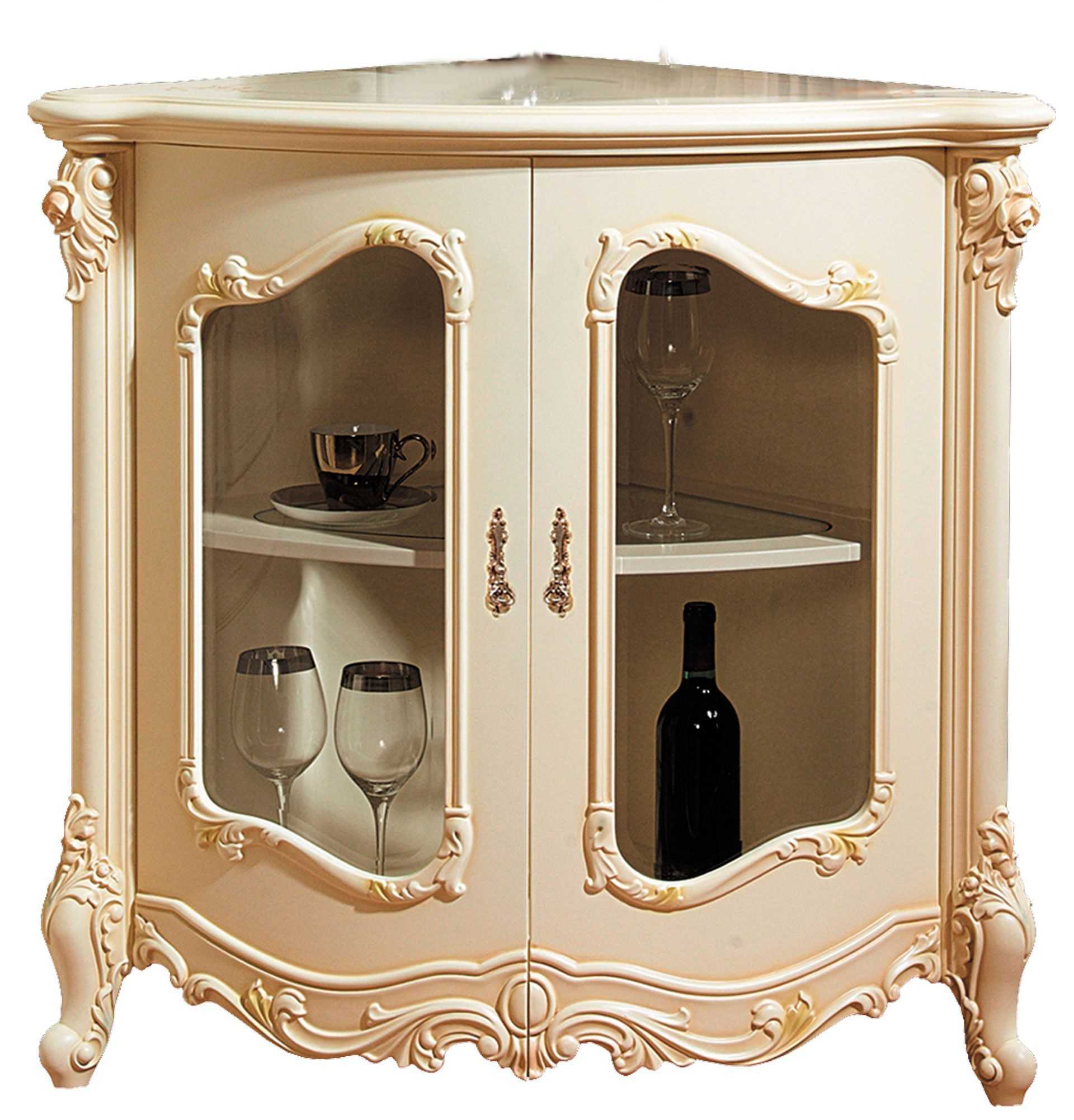 Большинство стеклянных витрин – напольного типа, но встречаются навесные. Напольные – самые устойчивые модели, на сплошном основании или изящных фигурных ножках, их можно до предела нагружать тяжелой посудой. Фурнитура – массивная золоченая.