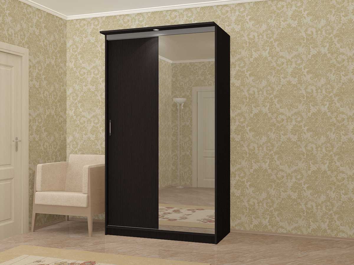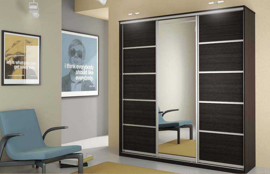 Наиболее изысканно будут смотреться шкафы купе венге с зеркальной поверхностью в гостиной. Если она слишком маленькая – такой ход станет уместным вариантом: зеркала визуально расширят пространство, делая атмосферу комнаты более загадочной. В таком случае необходимо подобрать алюминиевый профиль цвета металлик.