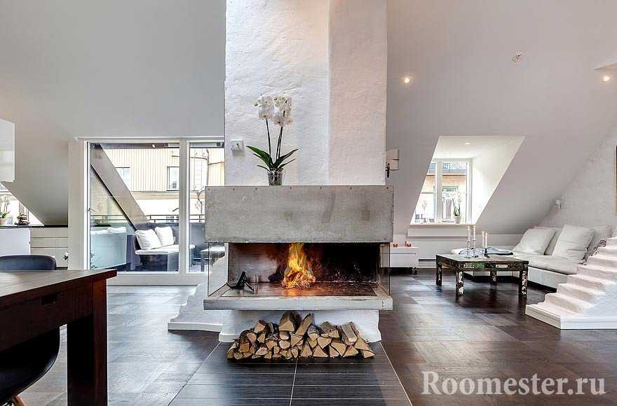 Дизайн камина в мансардном помещении очень индивидуален, обязательно учитывает степень нагрузки, систему вентиляции. Если перекрытия в доме деревянные, останавливаются на электрических моделях или тех, что работают на биотопливе.