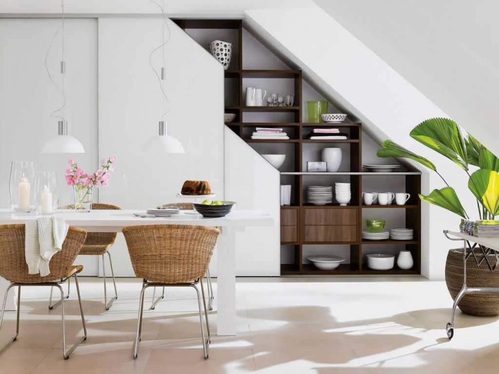 Даже наиболее низкие и мертвые зоны (высотой от 60 см) нельзя оставлять без дела, теряя такое необходимое пространство. Оно может стать удобным и почти незаметным способом хранения. Невысокие встроенные комоды, а также длинные стеллажи в нижней части скошенной стены можно использовать для хранения самых разных предметов быта.