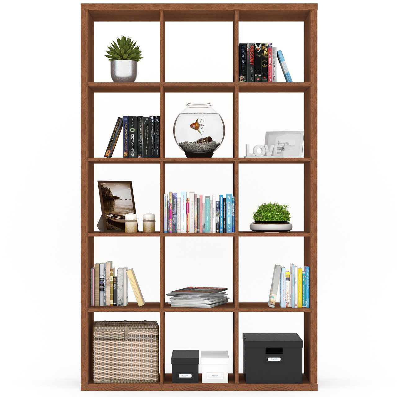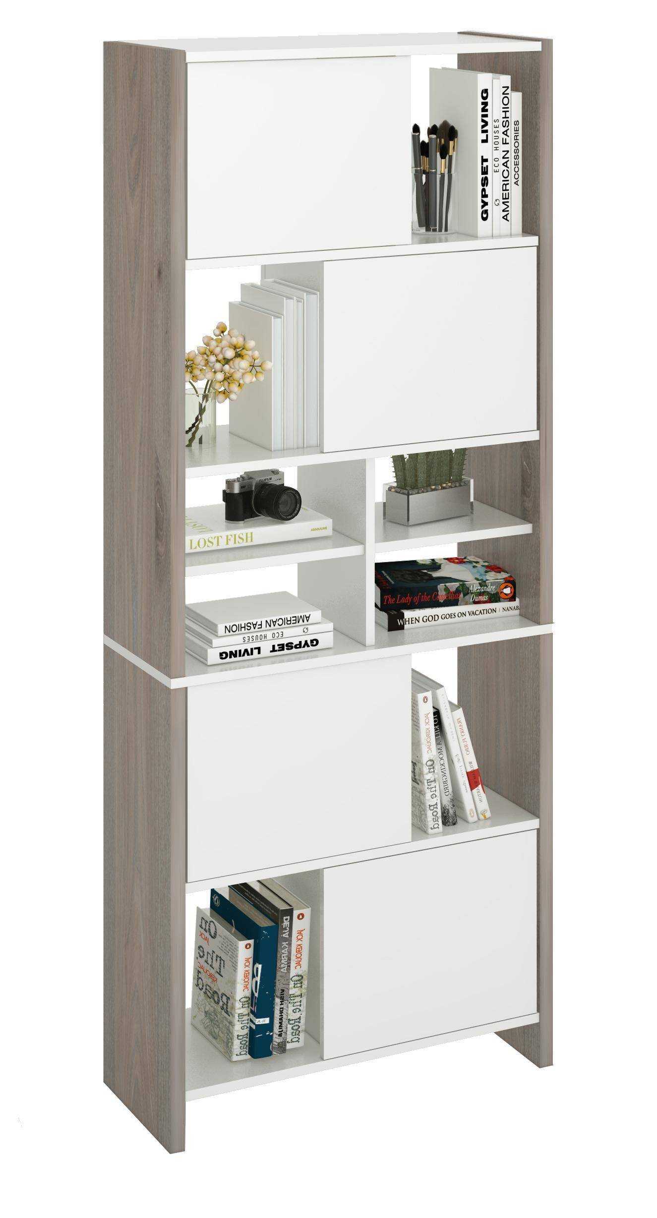 Открытый шкаф-стеллаж — наиболее популярный вид. В подобных моделях отсутствуют дверцы, а зачастую и задняя стенка. Расположение полок может быть симметричным или произвольным. Варианты удобны в использовании за счет доступности хранимых вещей. Изделия могут служить в качестве украшения интерьера или элемента зонирования пространства. Их недостаток — подвержены скоплению пыли.