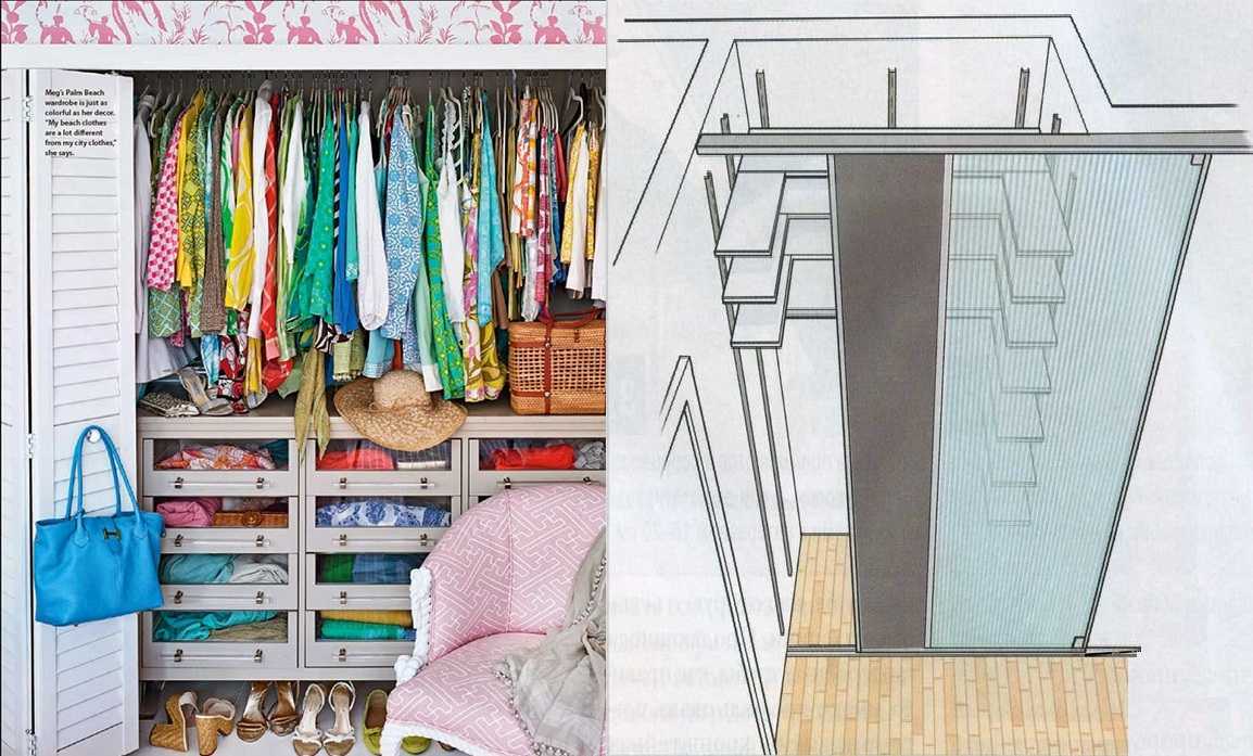 На высоте 50-60 см, под вешалками устанавливают полки или ящики для хранения вещей, обуви. При таком варианте обычно двери открываются наружу. Иначе в открытом состоянии они закрывают доступ к части одежды. Но, если гардеробная выходит в узкое или темное помещение (коридор, например), двери должны открываться наружу. Потому что высока вероятность того, что забыв закрыть двери, можно врезаться лбом к торец приоткрытой двери. Это много хуже неудобства.