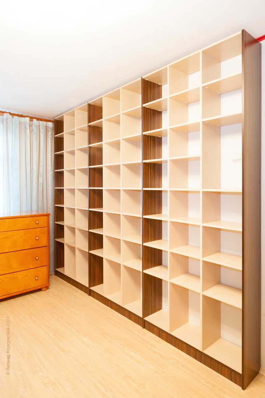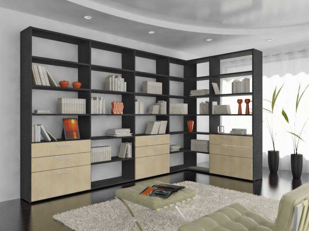 В просторных помещениях прямой стеллаж устанавливают возле стены или между окнами. При размещении шкафа перпендикулярно стене возможно своеобразное деление помещения на зоны. Если установить модель без задней стенки и с ящиками внизу, то такая импровизированная стенка не будет затенять комнату, но четко разграничит пространство.
