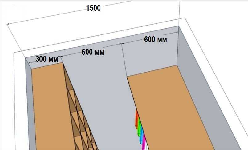 При ширине гардеробной в кладовке от 150 см, можно устраивать двустороннюю систему хранения — справа и слева от входа. В этом случае двери располагают так, чтобы с одной стороны оставалось расстояние до стены в 55 см (с учетом установки дверной коробки и наличника получится 60 см). Тут можно разместить зону с вешалками. С другой — во всю стену сделать полки шириной 30 см.