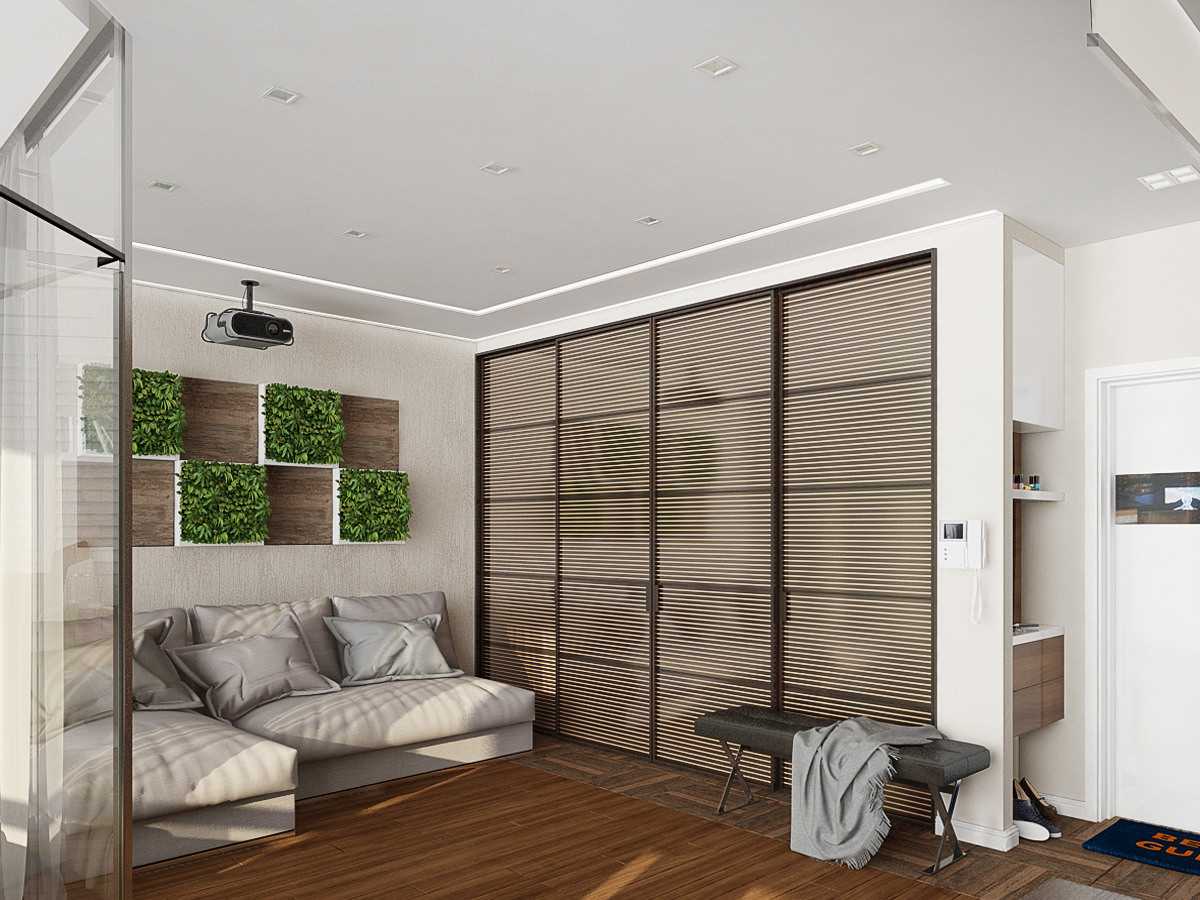 - В гостиной редко можно встретить гардеробную, но если она есть, то это чаще всего небольшая комната, встроенная в стену. Она скрывается за раздвижными дверями и визуально не заметна с первого взгляда. Это удобное хранилище для одежды, особенно если двери оформлены с помощью дизайнерских приемов, которые еще больше маскируют конструкцию. Но подобная планировка нередко возможна только в элитных апартаментах и частных домах с габаритными гостиными.