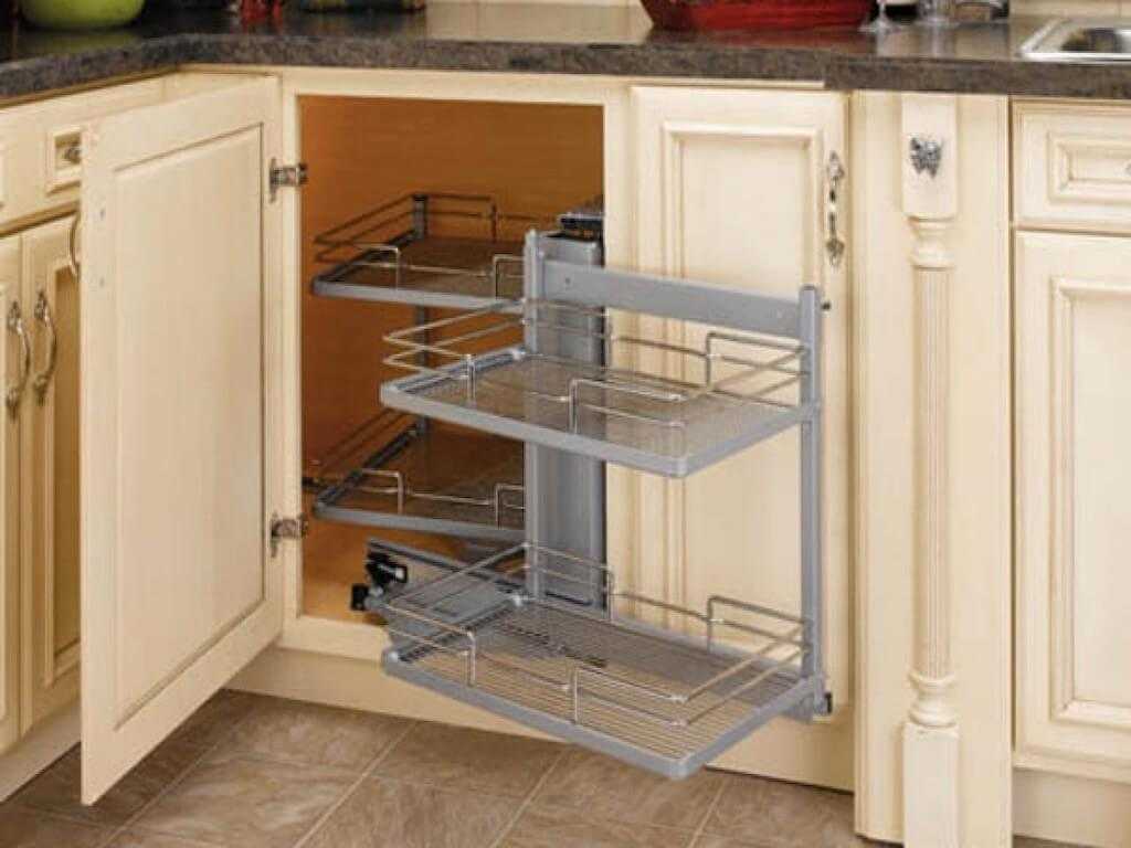 Продумать хранение в угловой тумбе очень важно, поскольку не всегда есть возможность дотянуться до самых потаенных уголочков, а поместить туда как можно больше очень хочется. Для этого производители разрабатывают все больше и больше интересных идей, например: