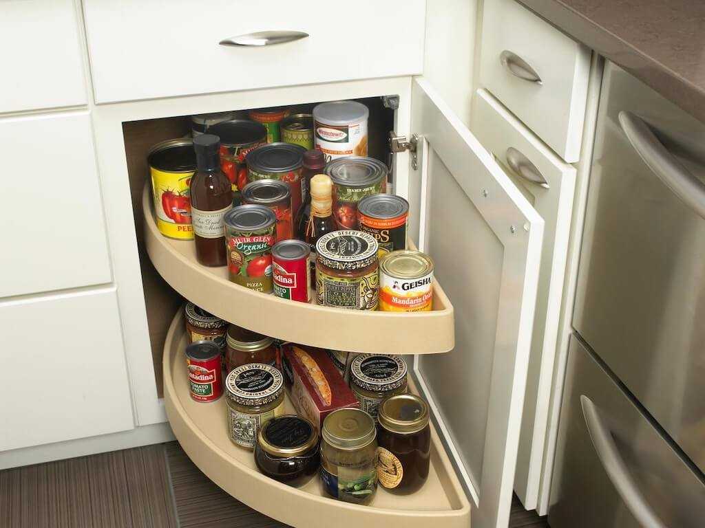 - поворотные корзины и карусели — подойдут как для хранения мелочей, так и крупной посуды, максимально функциональны;