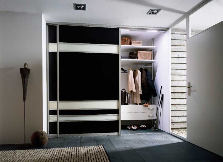 Даёт возможность правильно организовать имеющееся небольшое пространство для хранения вещей и обуви. За дверцами находятся полки, обувницы, антресоли. Можно развешивать на плечиках рубашки и платья.