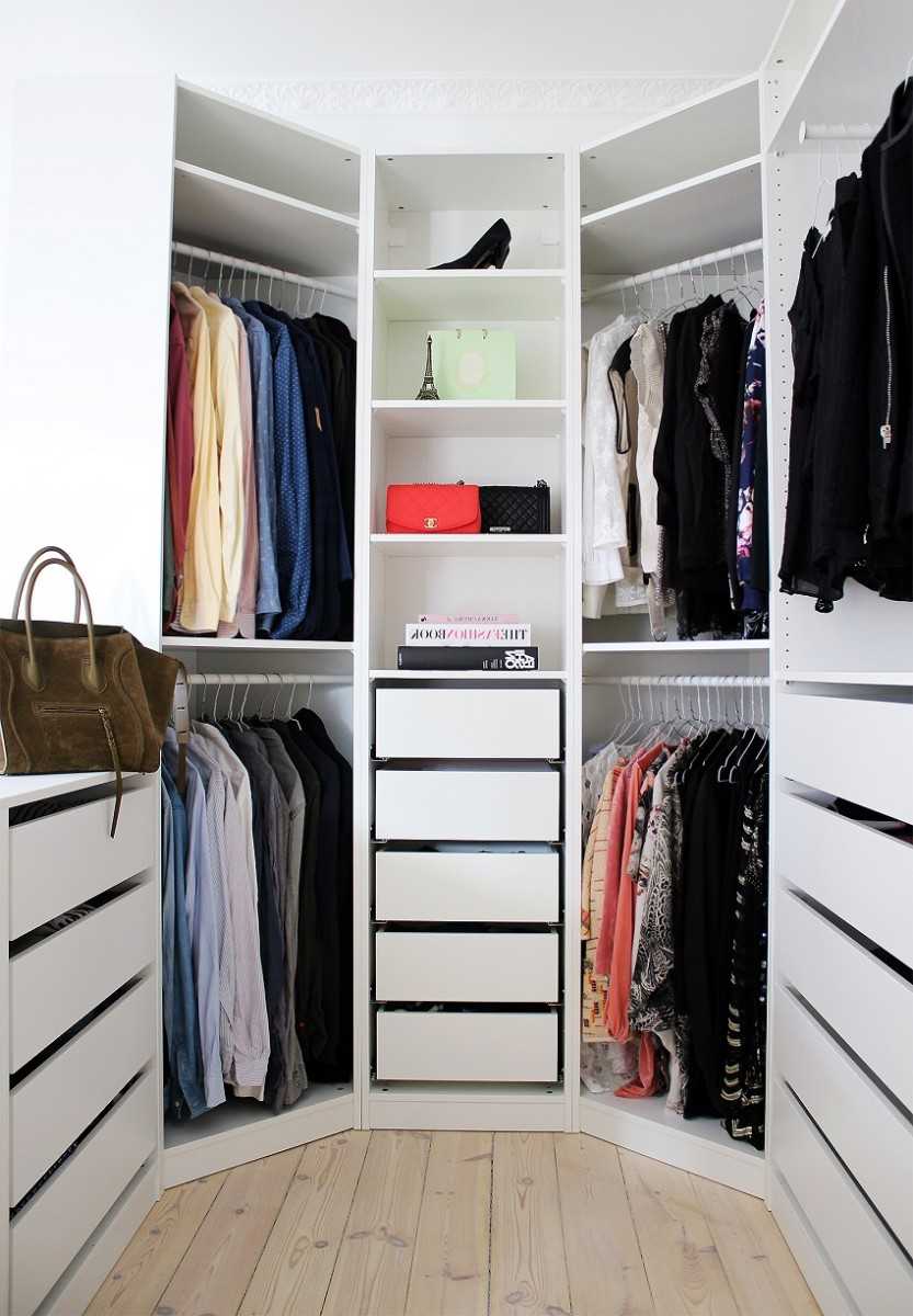 Для комфортного хранения вещей используют угловую гардеробную систему. Она должна включать достаточное количество стеллажей, выдвижных ящиков, штанг под плечики и трансформируемых вешалок.