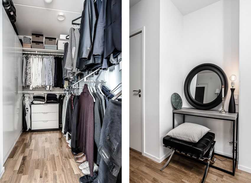 Отличный выход — установка гардеробной в спальной комнате, ведь это даст возможность подобрать и примерить на себе нужный наряд на каждый день.