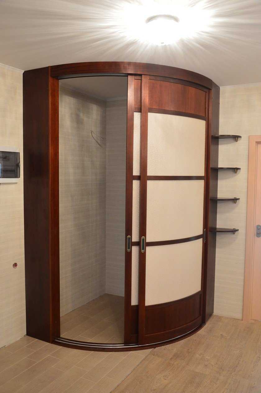 Такое решение, как радиусный встроенный шкаф-купе, находится на пике популярности в современном интерьере. По конструкции это тот жек угловой шкаф, его особенностью являются фасады изогнутой формы, которые движутся по таким же радиусным направляющим. Смотрятся радиусные шкафы стильно и современно. Они бывают нескольких видов: