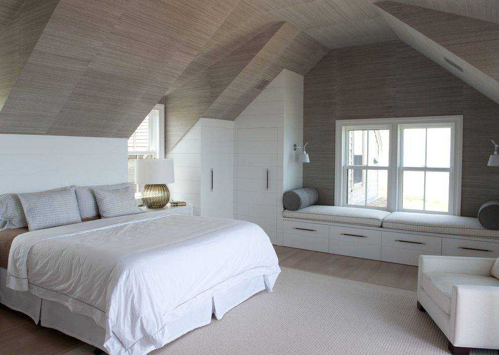 Стены с выступом или области с наклонным потолком часто оставляют пустыми, но вы можете заполнить их мебелью, на которой вы сидите или лежите, освобождая место в остальной части комнаты для более высоких элементов.