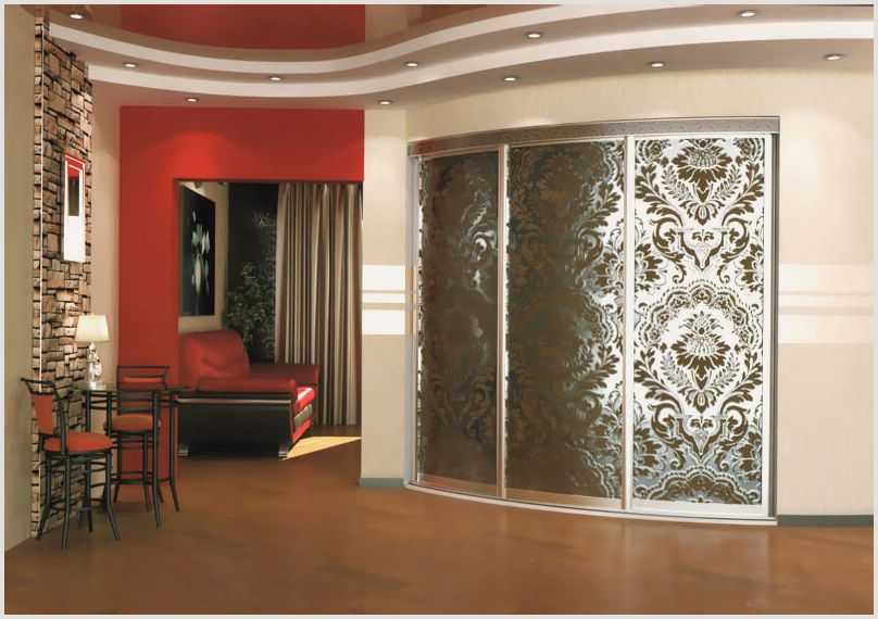 - радиусная модель имеет полукруглый вид и отличается нестандартной формой. Отлично подходит для установки в зал, декорированный в стиле арт-деко, ампир. Красивые модели с вогнутым фасадом эффектно дополняются открытыми стеллажами с полочками, на которых устанавливаются декоративные безделушки и сувениры. Существенный минус – высокая цена, сложность изготовления и монтажа (особенно S образных шкафов):