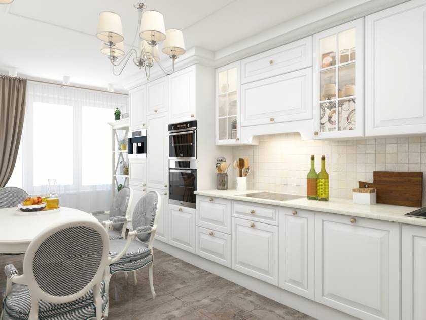 Прямая белая кухня в классическом стиле со встроенной техникой
