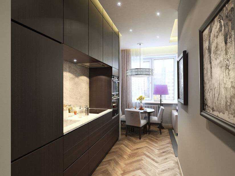 Самый интересный тот, при котором вдоль одной стены устанавливается плита, раковина и рабочая зона, а с противоположной от нее – холодильник и другие места хранения продуктов и мелкой бытовой техники.