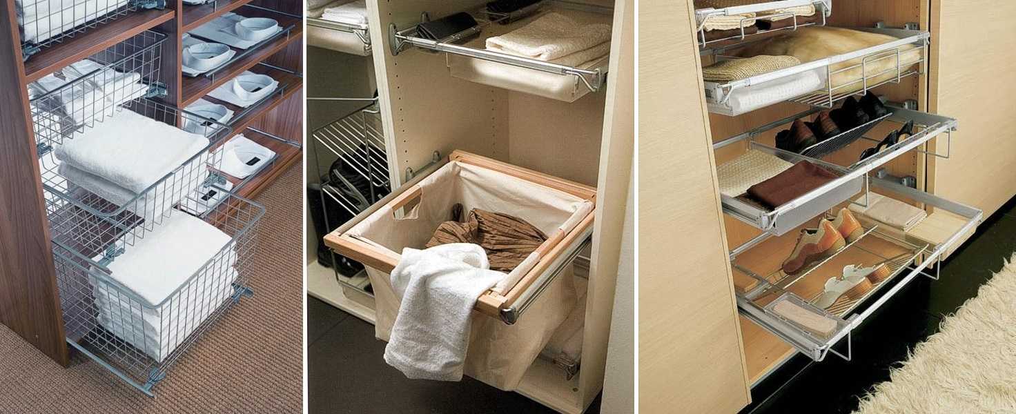 Оставшееся свободное пространство заполняют полками и выдвижными ящиками или проволочными корзинами. Тут можно будет хранить шляпы, сумки, варежки, перчатки, шарфы и т.д. Удобно иметь также отсек для зонтов. Особенно он нужен для длинных зонтов типа «трость». Распределение их произвольное — как вам кажется удобнее, так и делайте. Есть только один нюанс с выдвижными ящиками. Отсек где они находятся должен быть уже, чем ширина двери. Только в таком случае ящики будут выдвигаться.