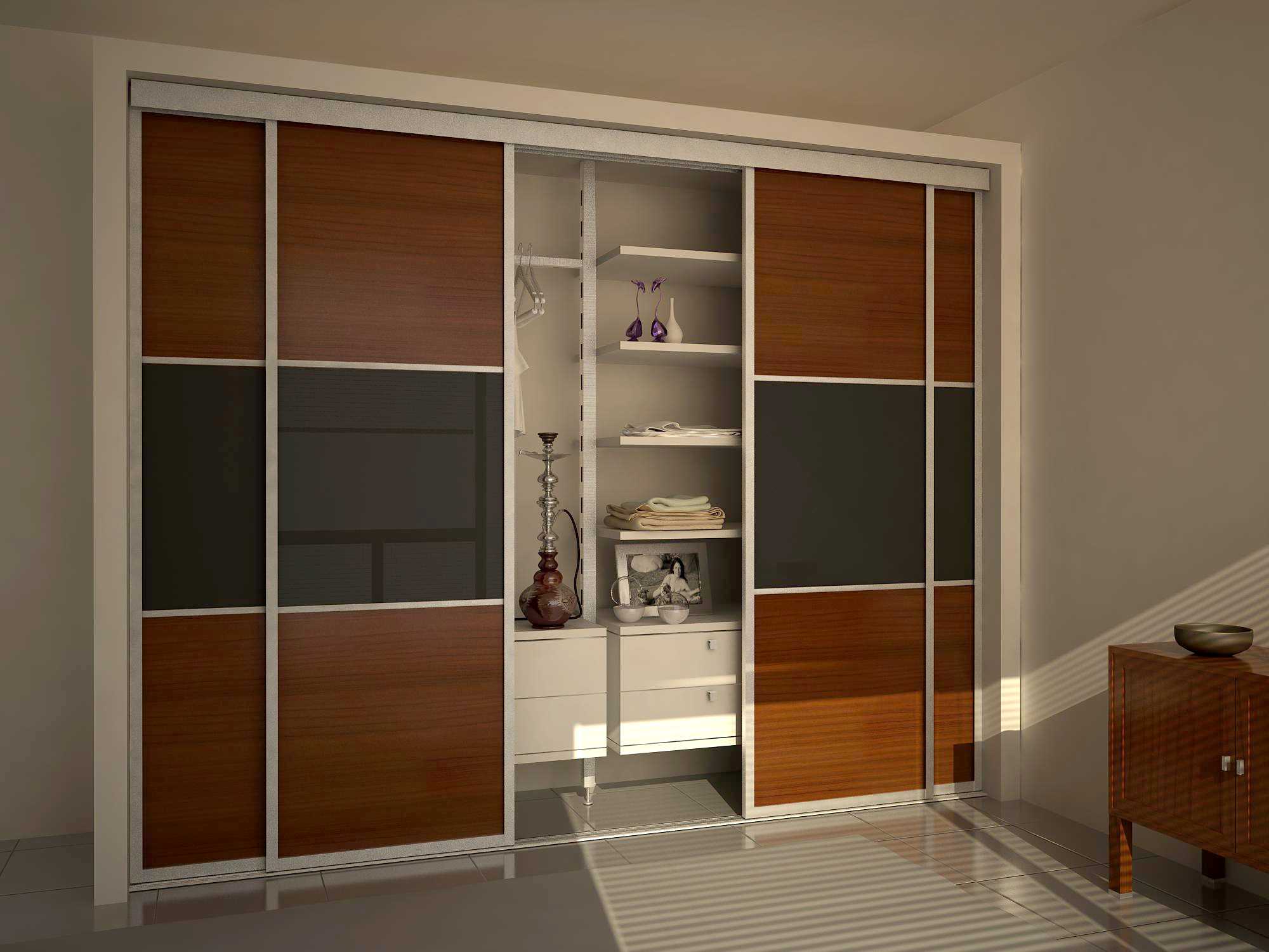 Приставка «купе» к рассматриваемому нами предмету мебели была добавлена совсем не зря. Дело в том, что двери у этого шкафа не совсем обычные. Так, закрывается он системой раздвижных панелей, что делает его: