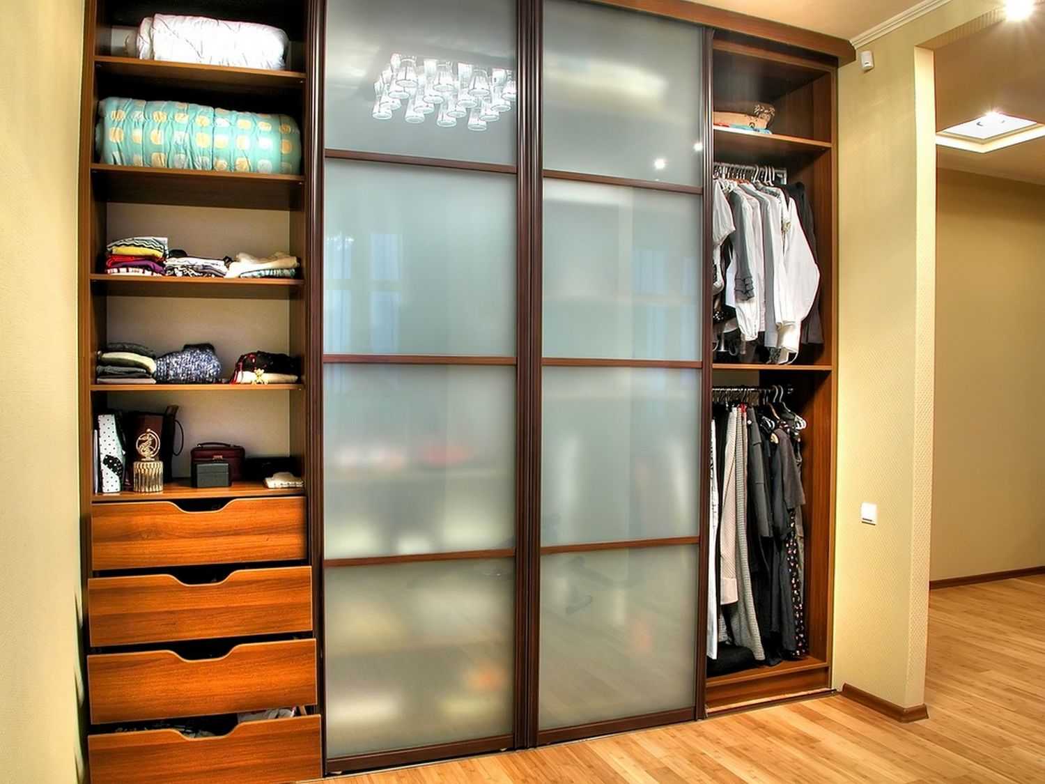 Шкаф-купе с полками и ящиками с матовым стеклом.