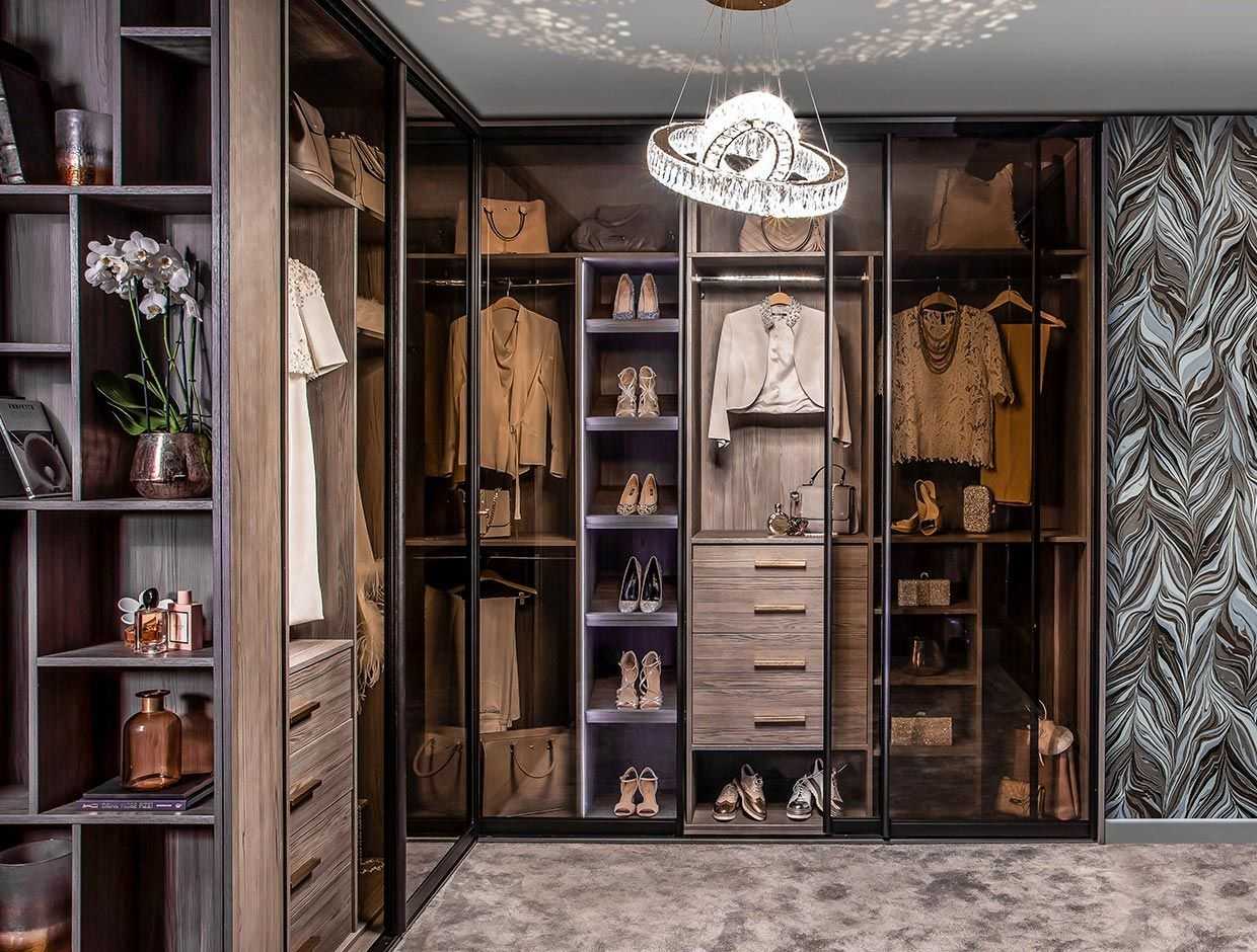 Г- образный угловой шкаф — подходит людям с огромным гардеробом. Его конструкция выглядят в форме буквы Г и состоит из двух, стыкующихся на торцах шкафов. Является хорошим вариантом для хранения многочисленных вещей, а за счет декорации стеклом выглядит не только ни заметным, но и очень практичным.