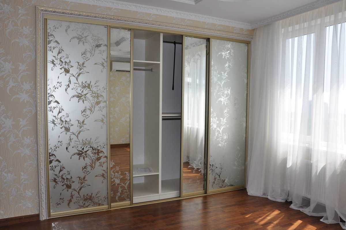 - купе с пескоструйным рисунком — тематику рисунков выбирают, ориентируясь на дизайн комнаты, стиль исполнения шкафа. При использовании пескоструйной технологии обработанная поверхность приобретает матовый эффект, хорошо подходит для зала или спальни. Пескоструйный рисунок наносят на специальном оборудовании по выбранному эскизу. Сюжет – цветы, узоры, пейзажи, животные. При оборудовании шкафчиком детской выбирают забавное изображение;