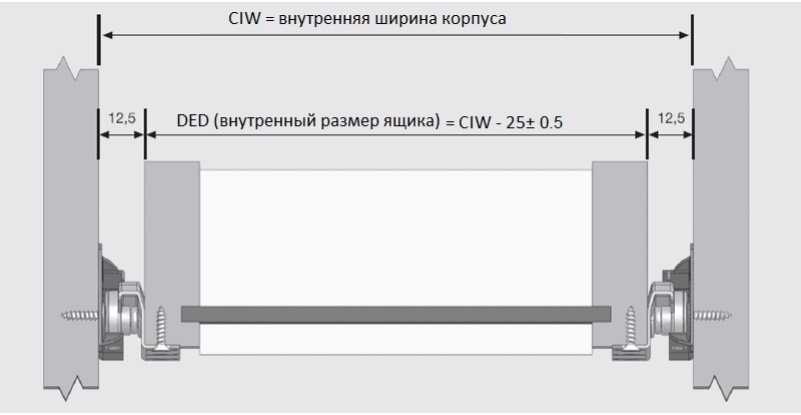 На самом деле, при расчетах эти цифры округляют, вычитая 13 мм. Так выдвижной ящик более свободно ходит и проще регулируется.