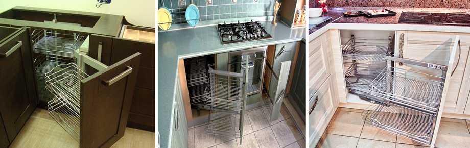 Эта система хранения самая удачная, так как занимает свободное пространство внутри углового гарнитура. Она объединила в себе две разновидности: карусельную и выдвижную. Для использования необходимо: