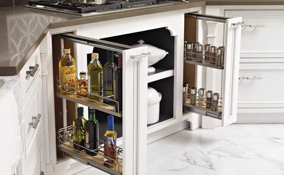 Необходимый элемент для угловой кухни, позволяющий экономить пространство и быстро находить необходимые вещи