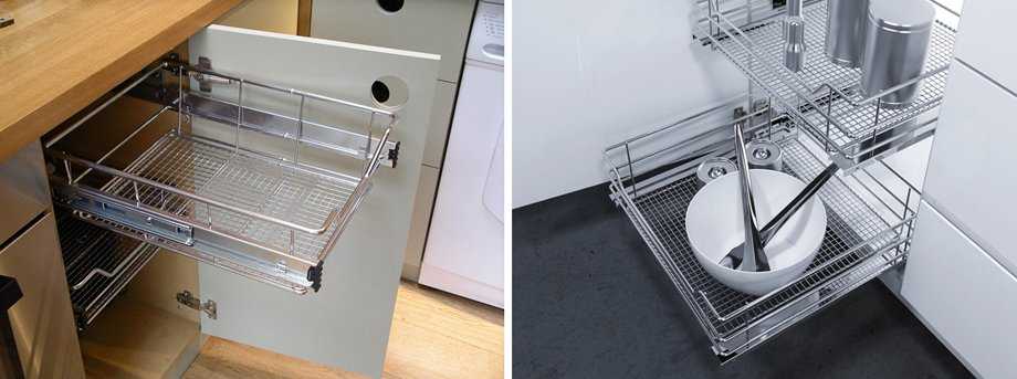 Для кастрюль и посуды больших объемов наиболее удобными являются ящики нижних ярусов с корзинами из пластика, который издает меньше шума при пользовании.