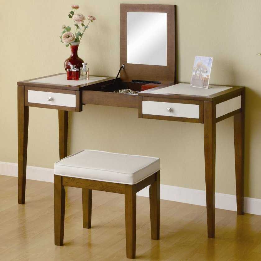 - Столик с откидным зеркалом. Зеркальная поверхность находится внутри столика. При необходимости столешница откидывается, и у вас появляется возможность воспользоваться зеркалом. Это своего рода складная мебель. Такая модель найдет себе место в самом маленьком помещении.