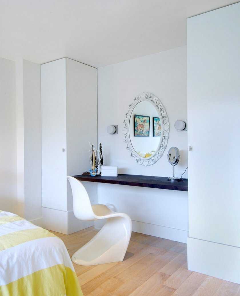 Маленький белый туалетный столик идеально впишется в небольшую по площади спальню, причем это может быть консоль с узкой столешницей вдоль одной из стен комнаты или угловая модель. Чтобы сэкономить еще больше пространства, зеркало можно будет повесить на стену. При этом нужно помнить о том, что освещение и столика, и зеркала должно быть максимально комфортным для нанесения макияжа.