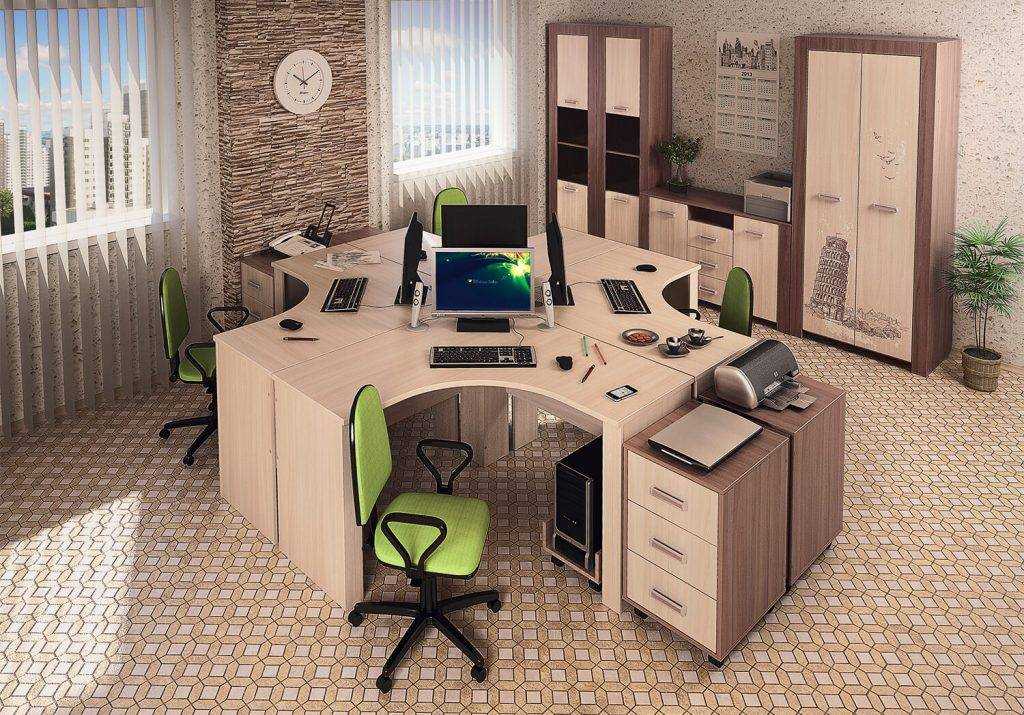 В столах углового типа столешницы в форме полукруга, что увеличивает площадь рабочей поверхности. Предметы расположены в зоне досягаемости. Угловой стол пользуется успехом в открытых офисах, где в одном помещении работают много сотрудников. Угловое расположение помогает отгородиться от ненужных отвлекающих моментов и сосредоточиться на работе.