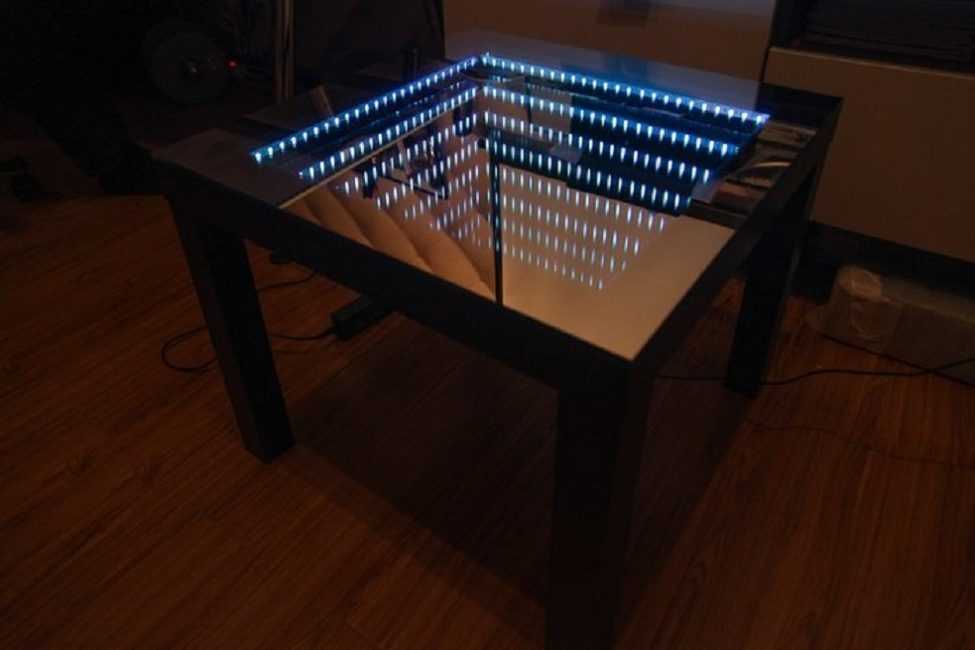 Закрепить по периметру стола подсветку, светодиодную ленту;