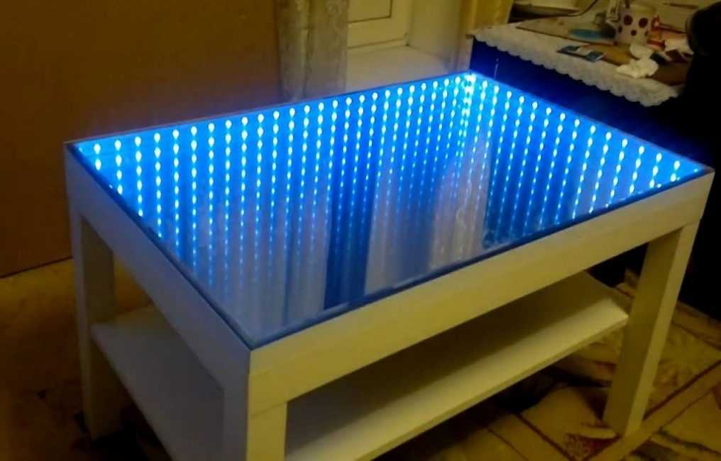 Креативный современный журнальный столик можно создать, вмонтировав в его столешницу подсветку из светодиодных лент. Стеклянная крышка в нем делается съемной, чтобы в случае выхода из строя источников света их легко можно было заменить.