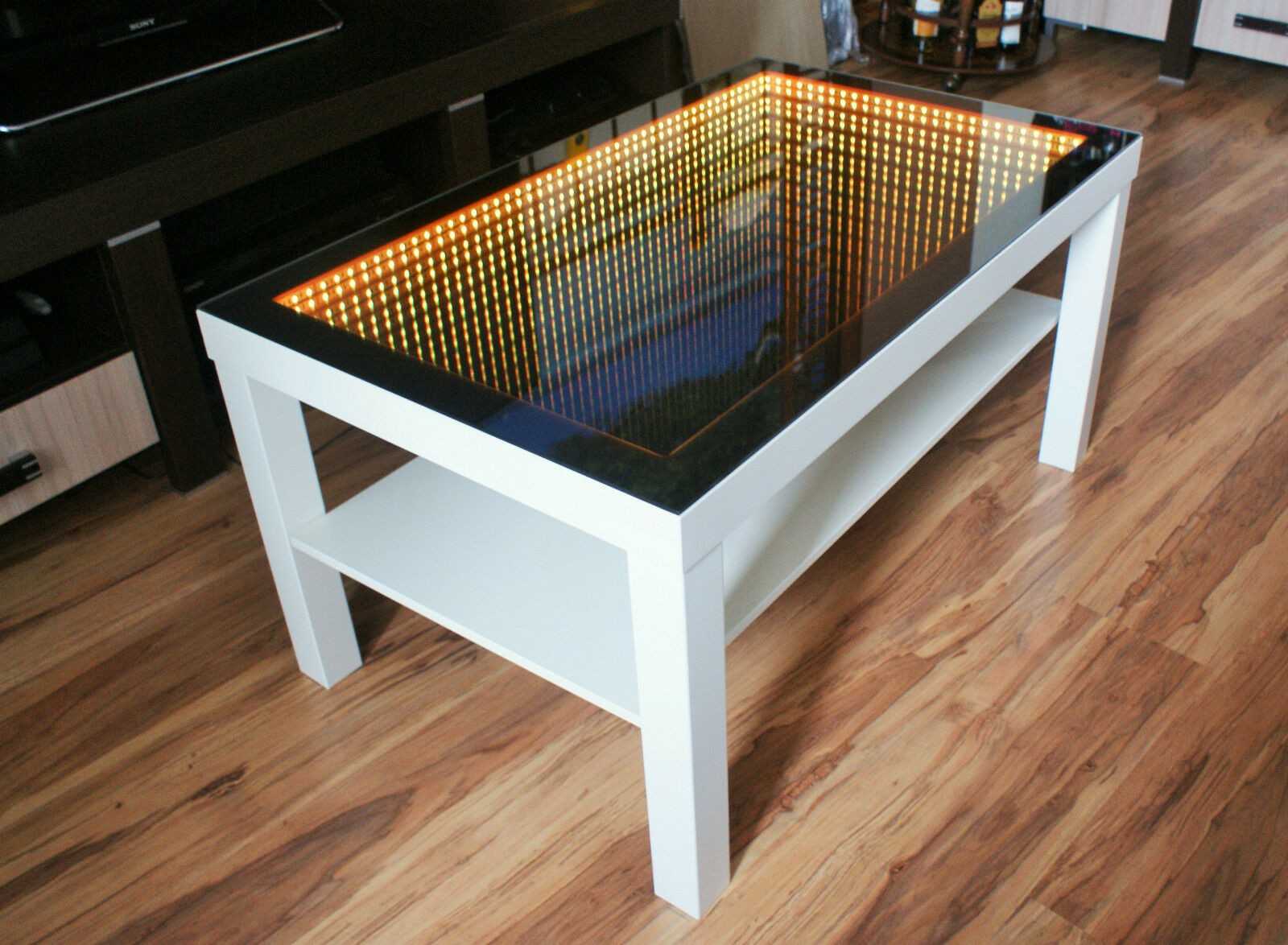 Внешне столик мало чем отличается от любого обычного журнального стола. Однако стоит включить подсветку, как столешница изделия начинает мерцать и светиться сотнями огоньков, создавая иллюзию бесконечности. Любоваться таким волшебством хочется постоянно, а равнодушных к необычному столу не найдется ни среди взрослых, ни среди детей.